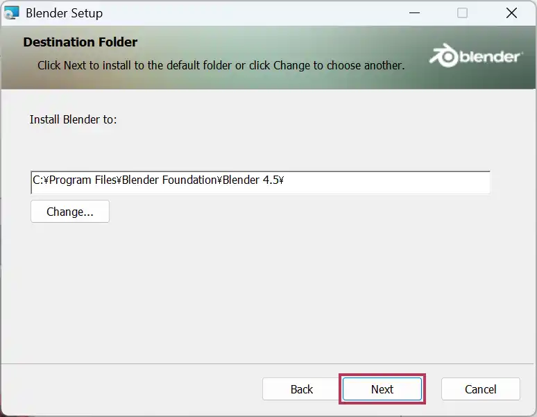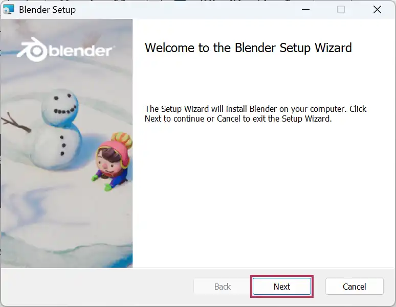 Blender Setupが開いたら、Nextボタンをクリックします。