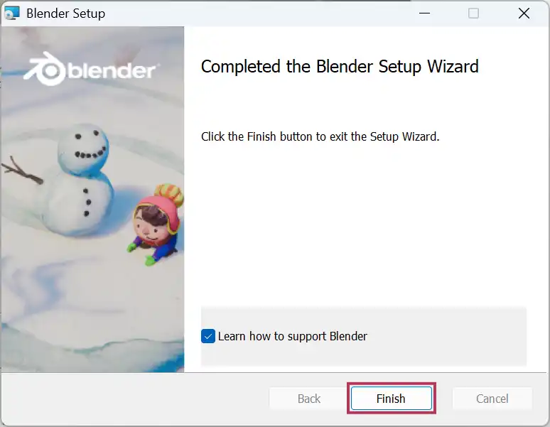 インストールが上手くいったら、Completed the Blender Setup Wizardのメッセージが表示されます。