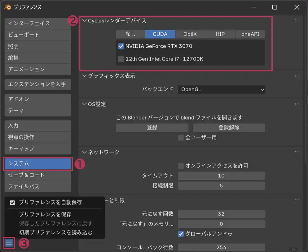 メニューバー:編集>プリファレンス>システム>Cyclesレンダーデバイスを変更します。ここでは、CUDAでRTX3070を選びました。