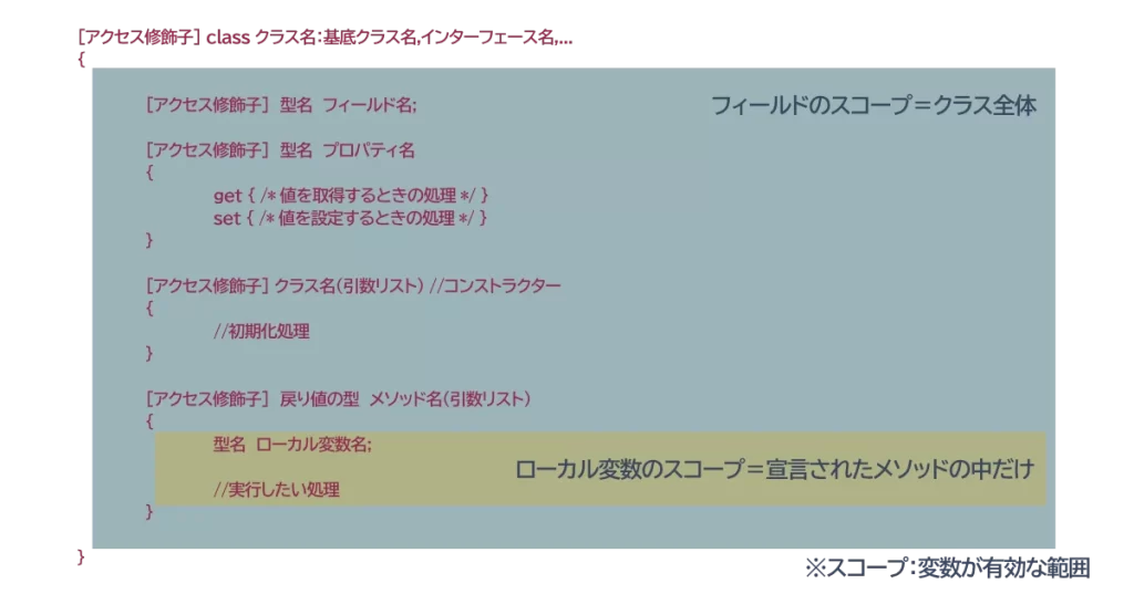 クラス全体です。クラス内のどのメソッドからでもアクセスできます。 - ローカル変数のスコープ: