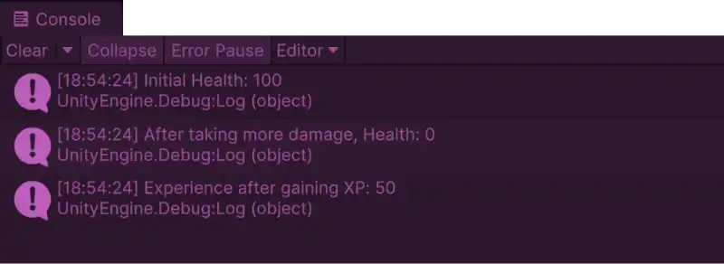Debug.Log("After taking more damage, Health: " + Health);