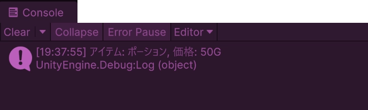 Debug.Log($"アイテム: {potion.itemName}, 価格: {potion.price}G");