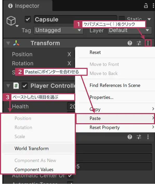 Positon,Rotation,Scaleの3つをコピーしたいので、World Transformを選びます。(コピーでComponentを選んだ場合はComponent Valuesを選ぶ)
