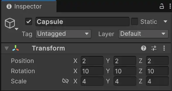 今回のように自身のオブジェクトのTransformのパラメータをWorld Transformでコピペする場合は、「今持っている値をもう一度上書きする」だけなので、見た目もインスペクターの数字も変化しません。