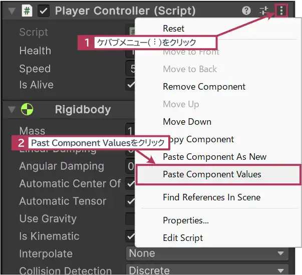 Component(Values)をコピペするときは、オブジェクトの親子関係を無視して、インスペクターの数字だけをコピーしたいときに使います。