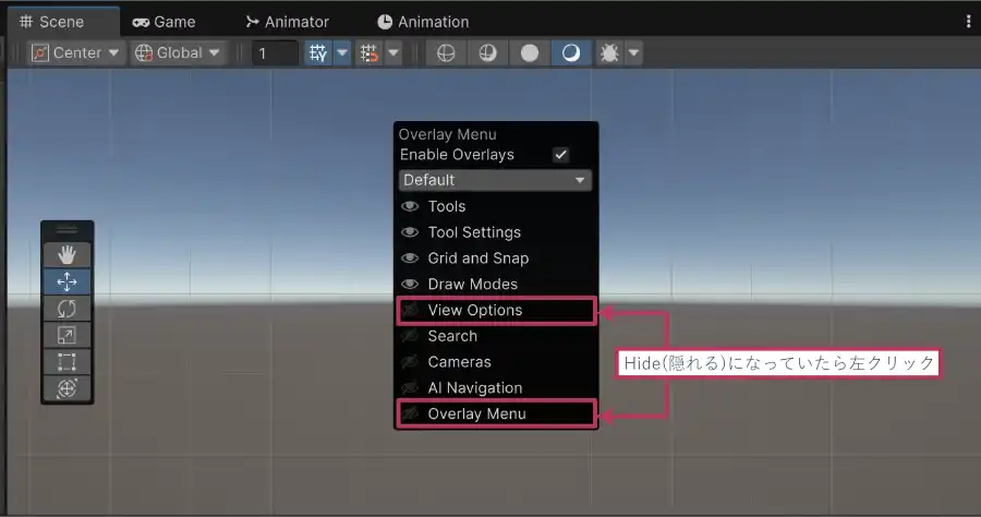 そもそも、ViewOptionsやOverlayMenuがSceneビューにない場合は?